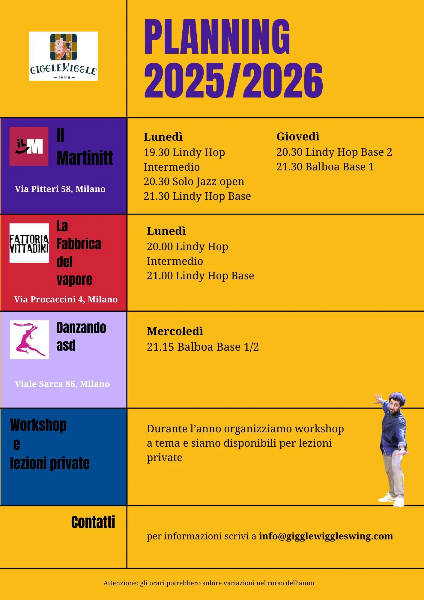 Propone corsi di Lindy hop, Solo jazz, Boogie woogie, Charleston, Tip tap in diverse sedi di Milano e provincia.